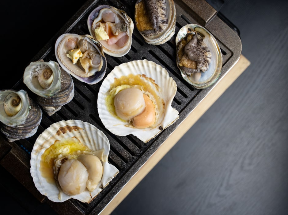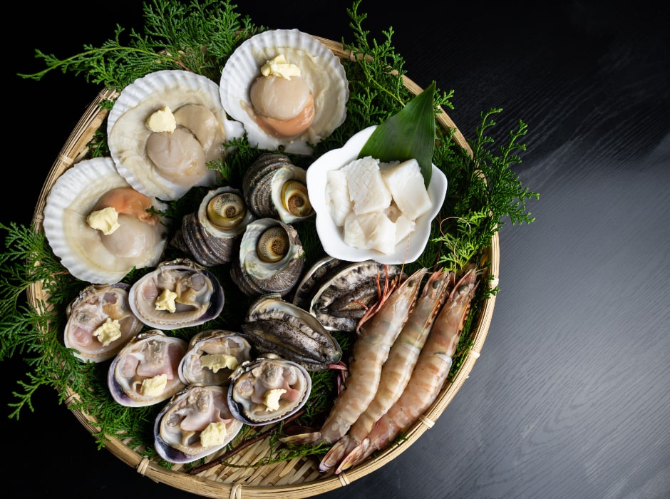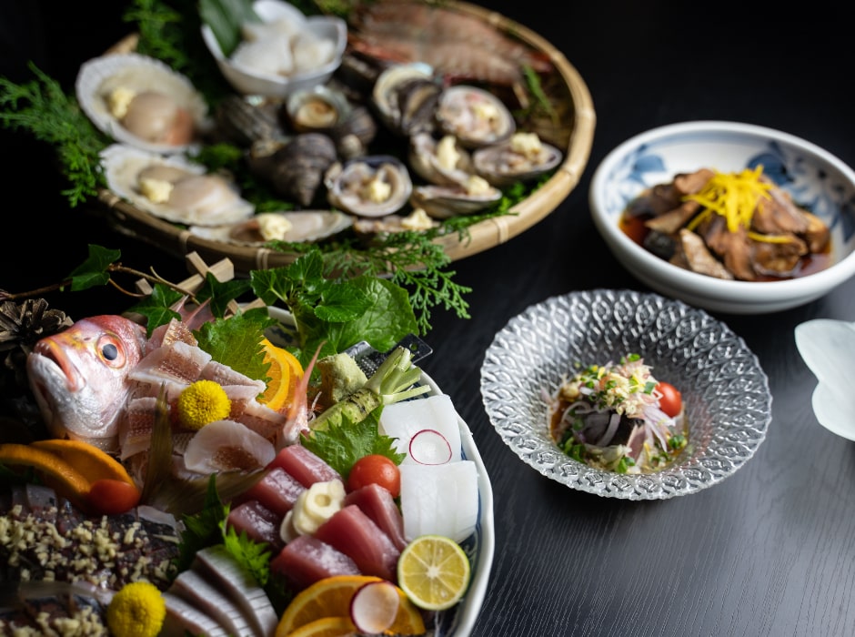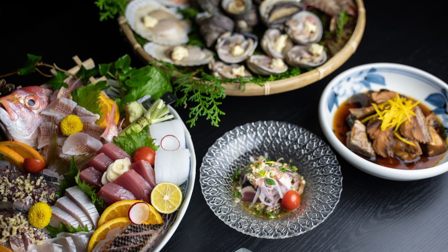 一、海賊焼きアワビ、サザエ、海老など、六種類の魚介焼き 一、お造り牟岐漁港に水揚げされる新鮮な旬のお魚 一、鰹のタタキ自家製ポン酢 一、アラ煮 一、酢の物 一、ご飯 一、味噌汁 一、フルーツ 一、自家製プリン ※魚介が苦手な方の阿波牛への変更や、伊勢海老の追加なども可能です。